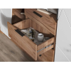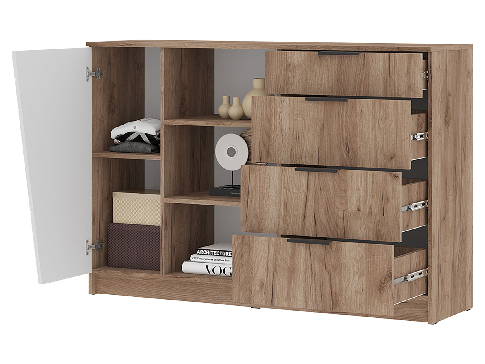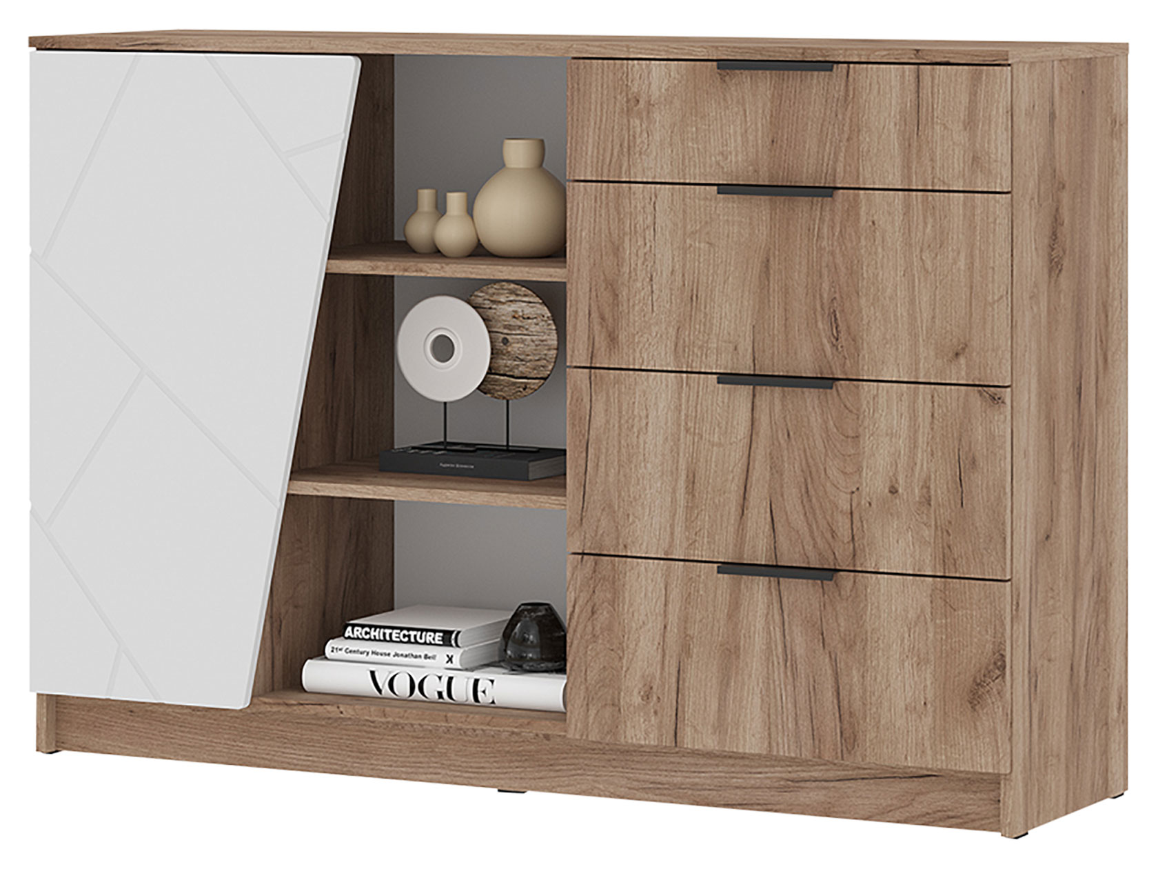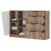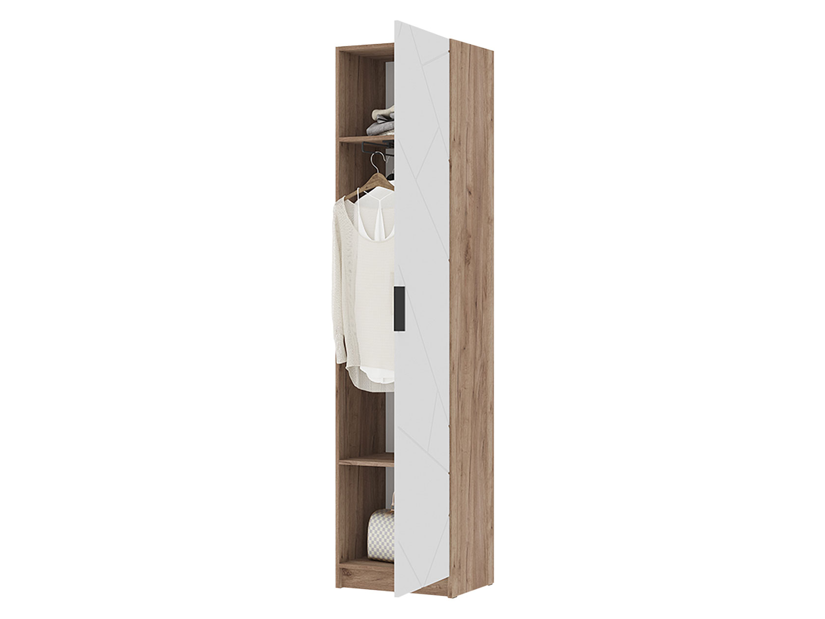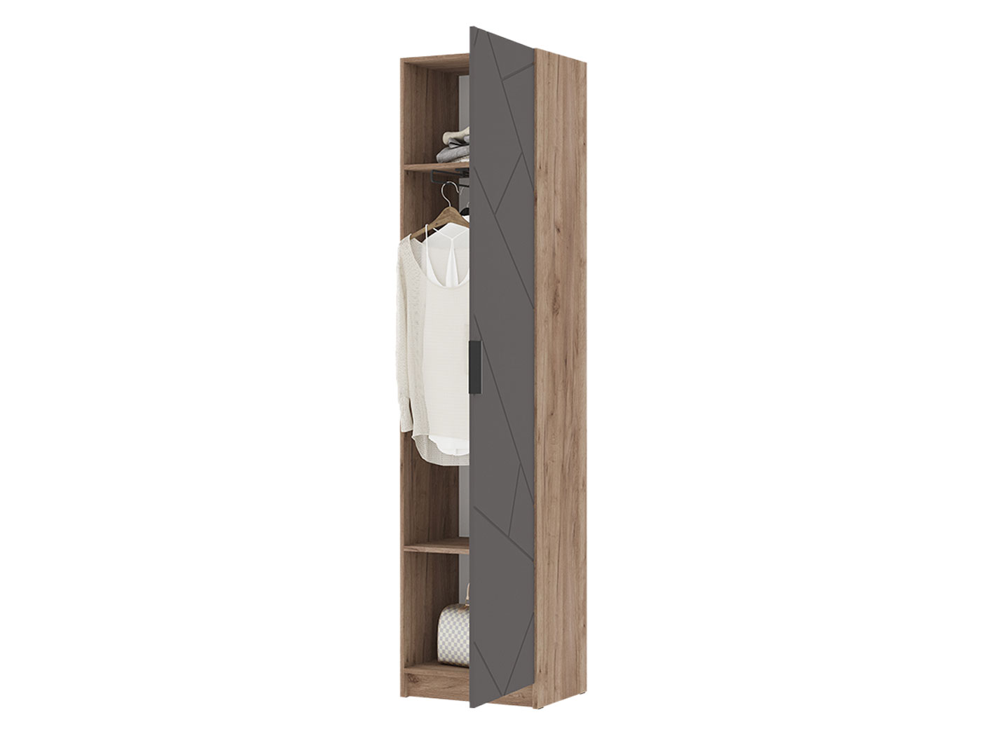 Гостиная Орегон украсит интерьер и добавит динамики пространству, где будет приятно провести время за просмотром любимого фильма или сериала. Ассиметричная фрезеровка на дверцах добавляет обстановке яркий акцент. Сочетание открытых полок и ниш за глухими фасадами позволяет аккуратно хранить самые разные вещи: от одежды до книг и декора.