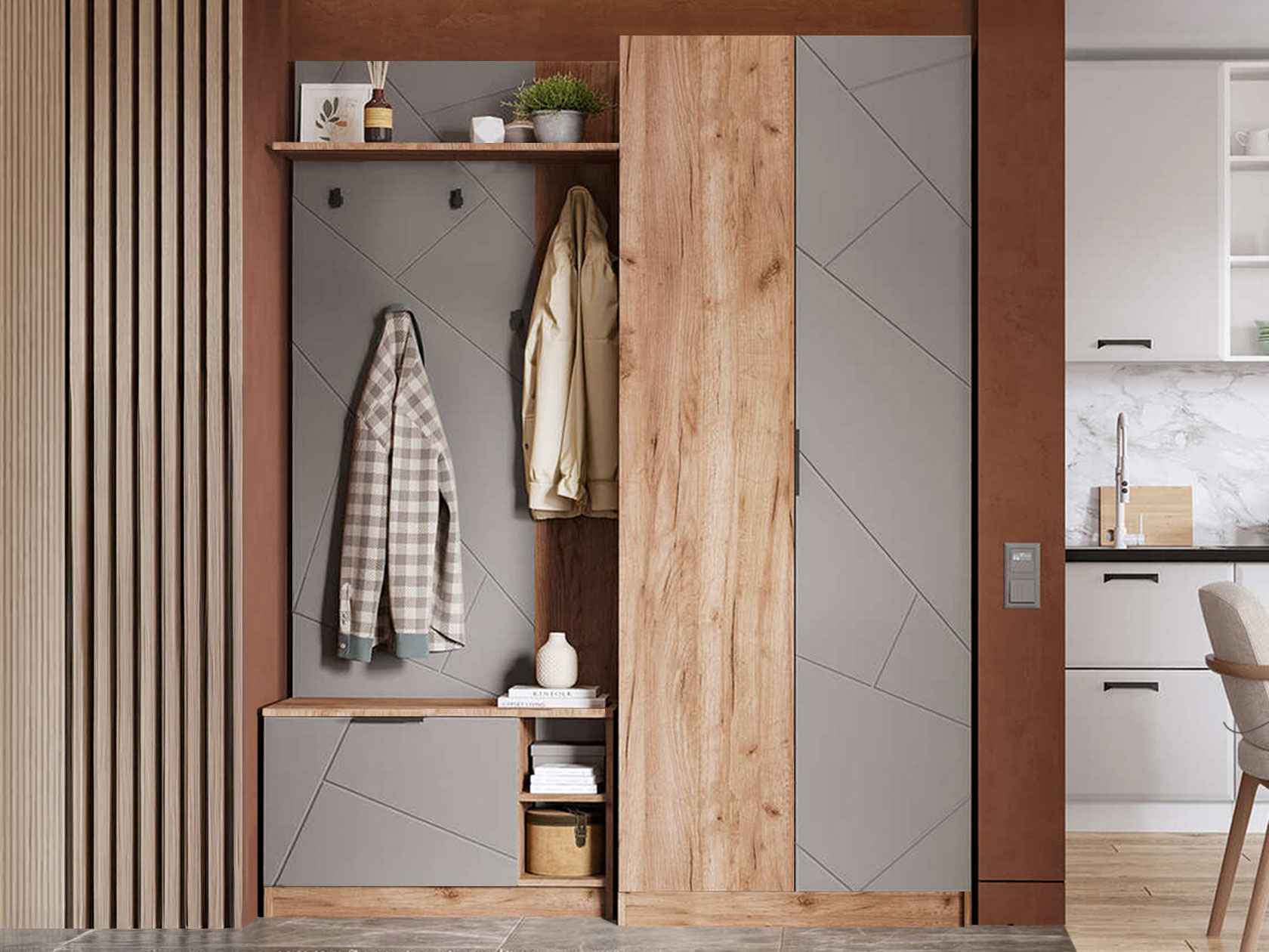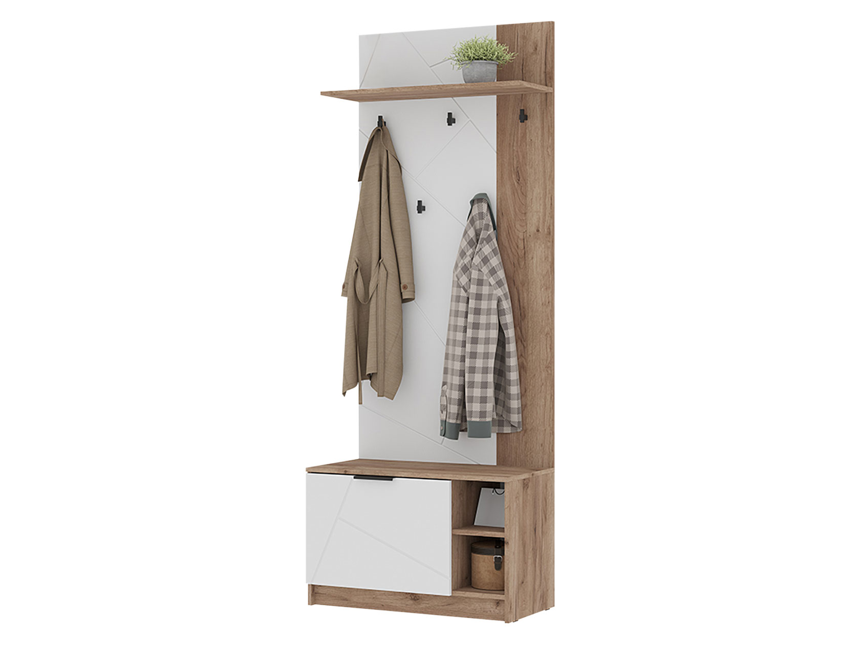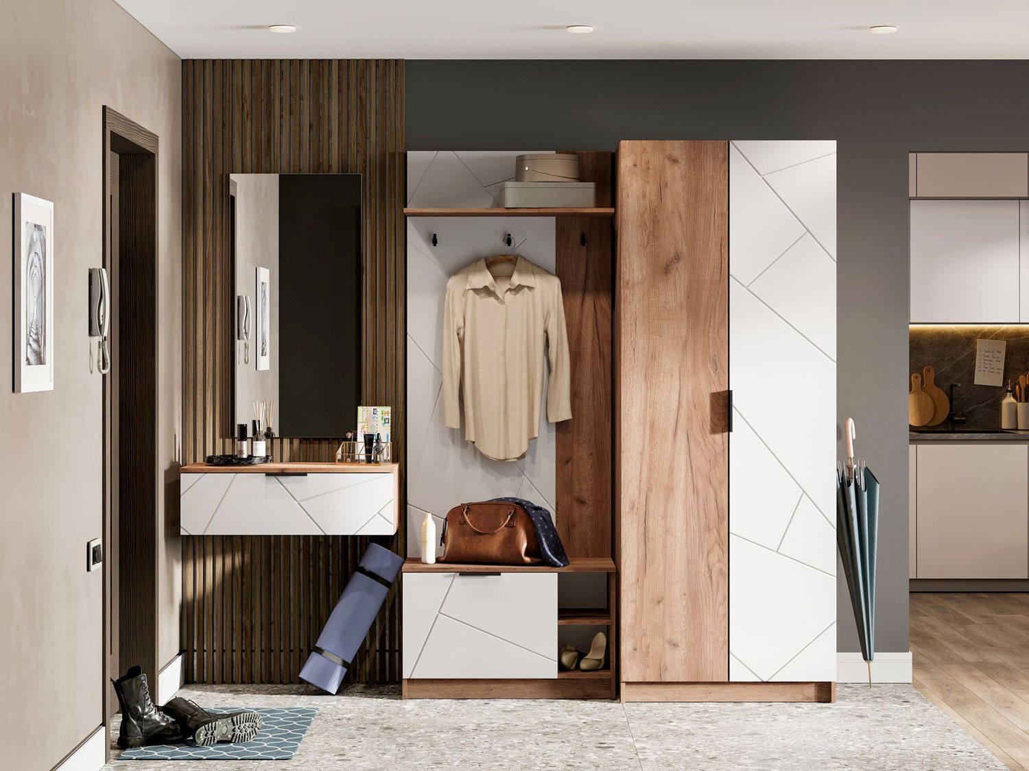 Прихожая Орегон Дабл позволит распределить повседневные предметы гардероба, обувь и аксессуары. Мебель с функциональным наполнением удачно интегрируется даже в ограниченное пространство. На открытой вешалке можно хранить одежду и сумки, а в распашном шкафу найдется место для сезонных вещей. Небольшая тумба выполнит роль обувницы, а ниши удобно использовать, чтобы дополнить интерьер интересными деталями.