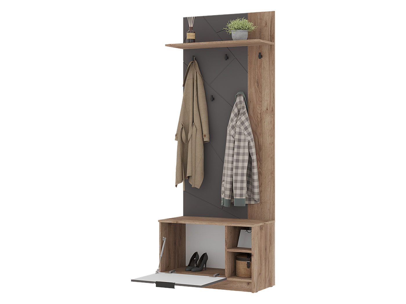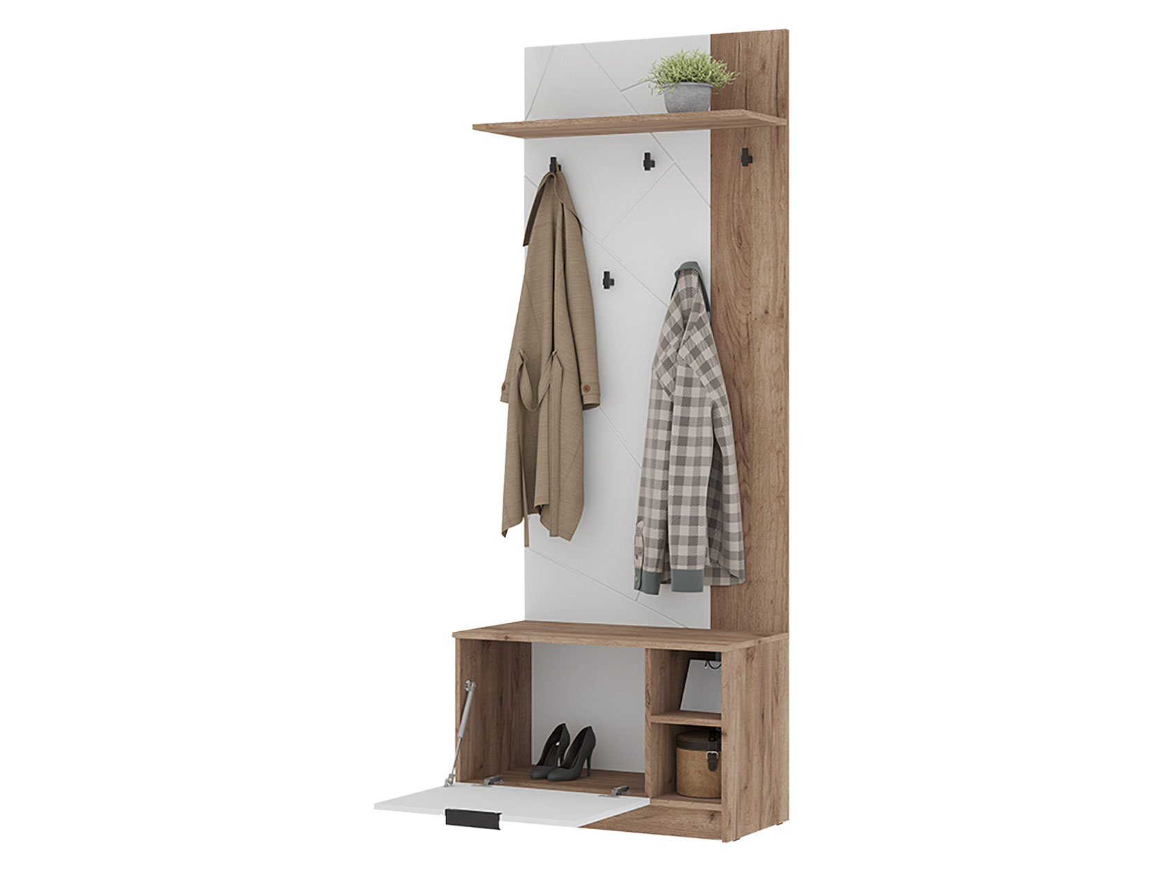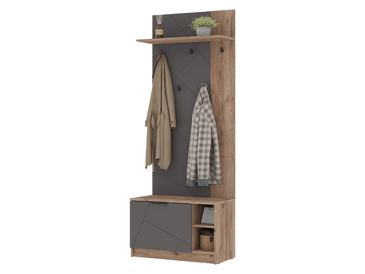 Прихожая Орегон Дабл позволит распределить повседневные предметы гардероба, обувь и аксессуары. Мебель с функциональным наполнением удачно интегрируется даже в ограниченное пространство. На открытой вешалке можно хранить одежду и сумки, а в распашном шкафу найдется место для сезонных вещей. Небольшая тумба выполнит роль обувницы, а ниши удобно использовать, чтобы дополнить интерьер интересными деталями.
