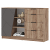 Комод Орегон — практичная модель с оригинальным дизайном, которая разнообразит интерьер любой комнаты. Выдвижные ящики плавно открываются на всю глубину, позволяя быстро найти нужный предмет. Фасад с геометрическим узором скрывает полки, где можно хранить документы и личные вещи. Открытые ниши идеально подходят для заполнения элементами декора.