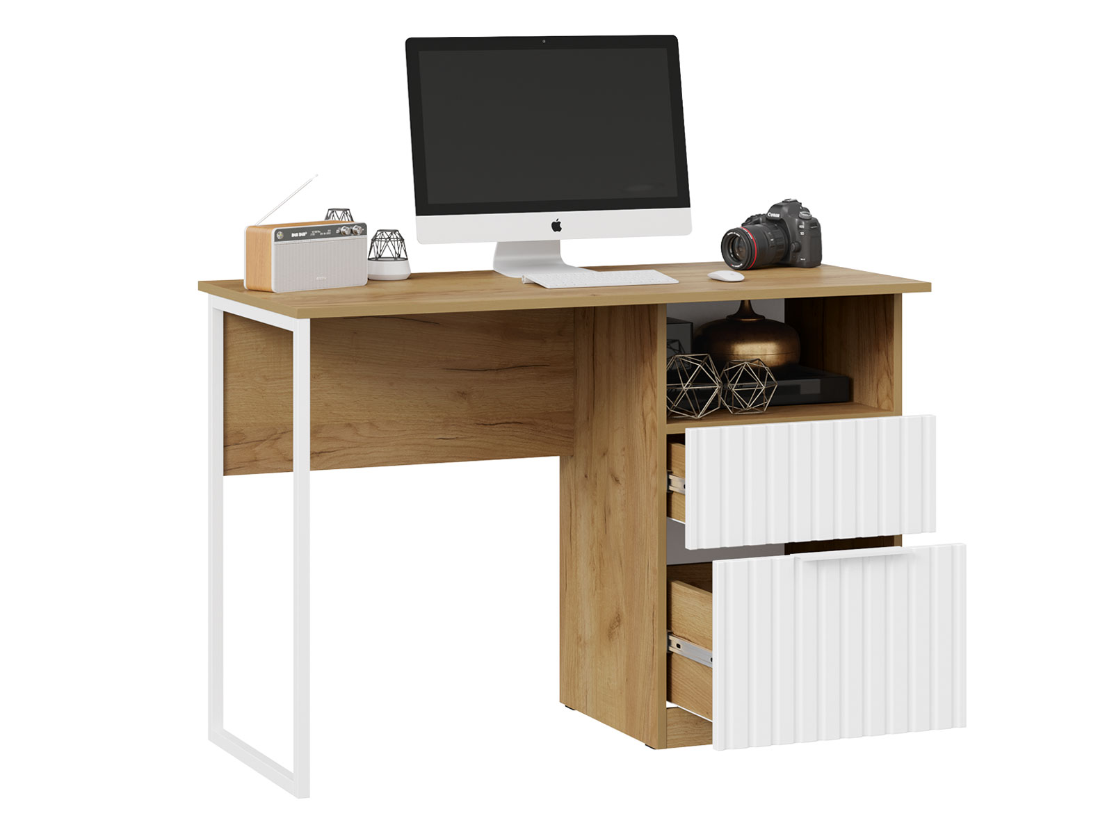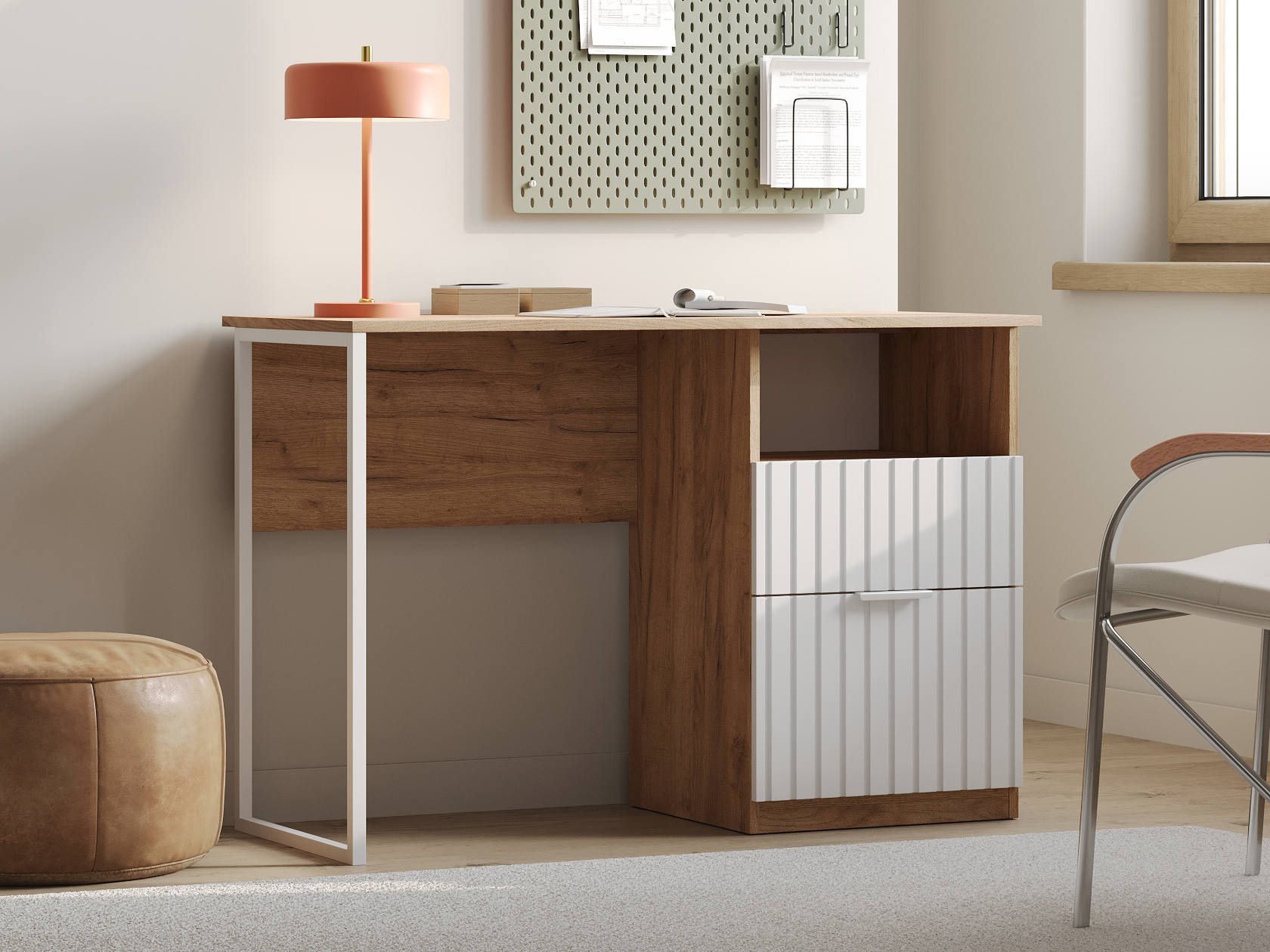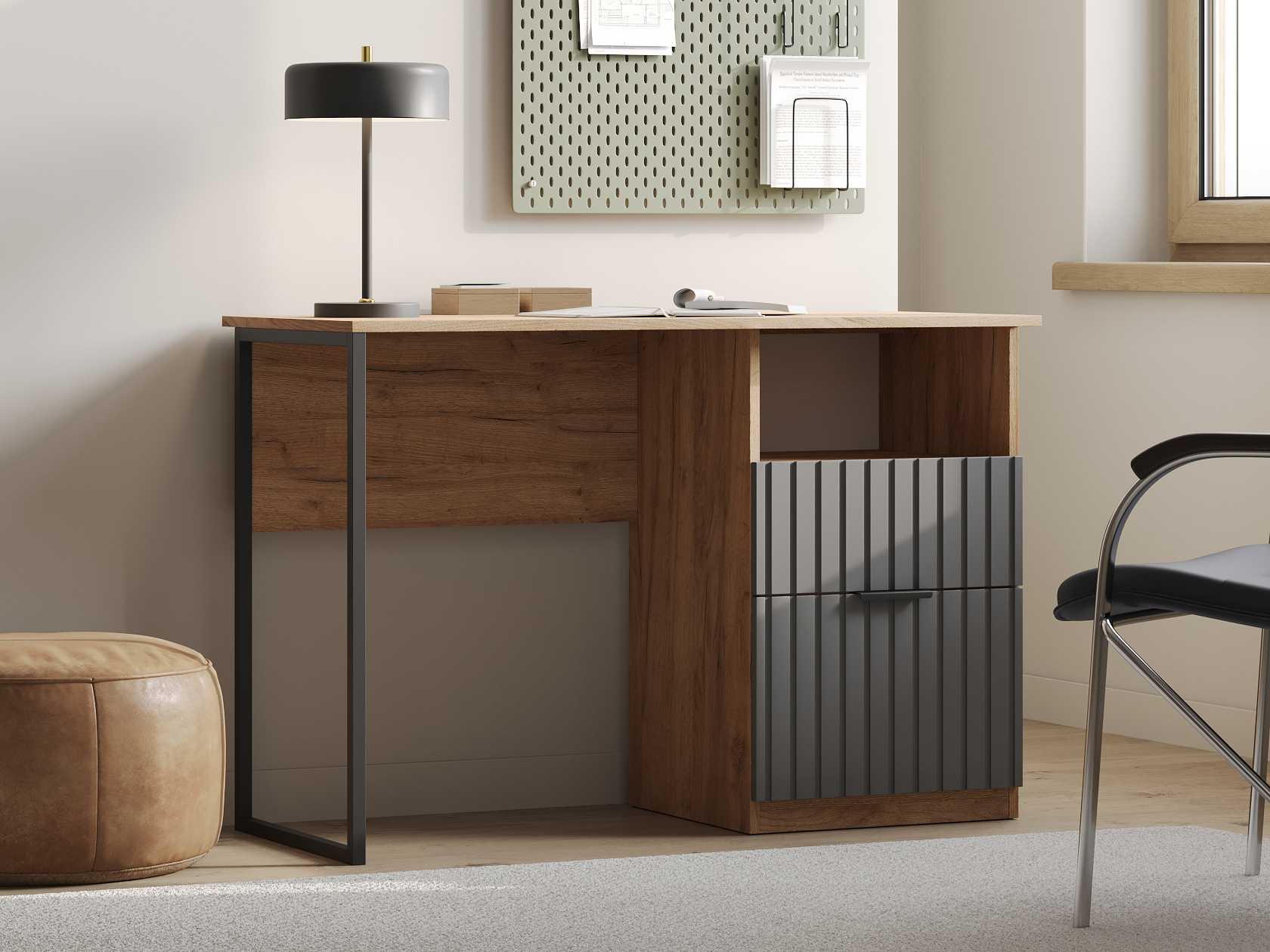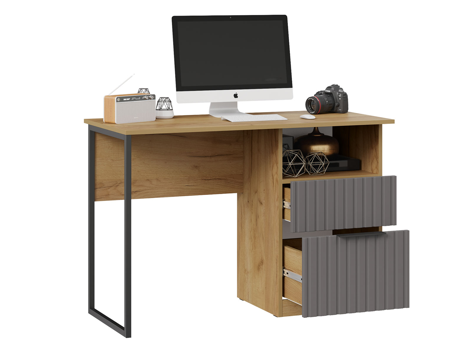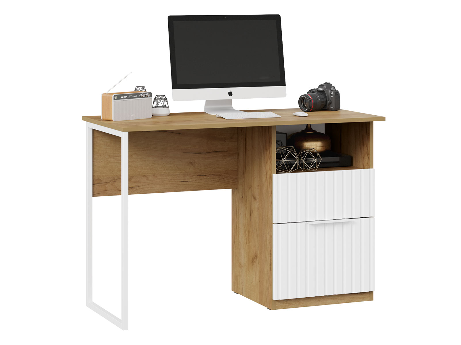 Письменный стол Хилтон привлекает внимание оригинальным сочетанием оттенков и продуманным оснащением. Выдвижные ящики и открытая ниша над ними организуют удобную систему хранения. Просторная поверхность с легкостью разместит всё необходимое для работы или учебы.