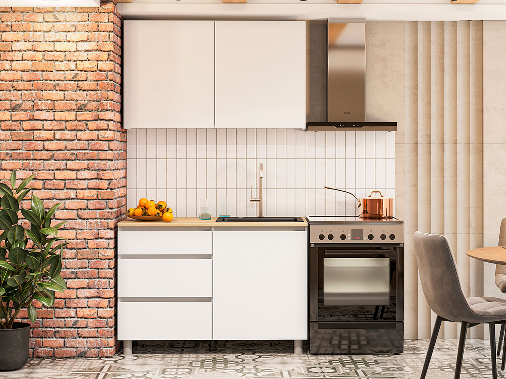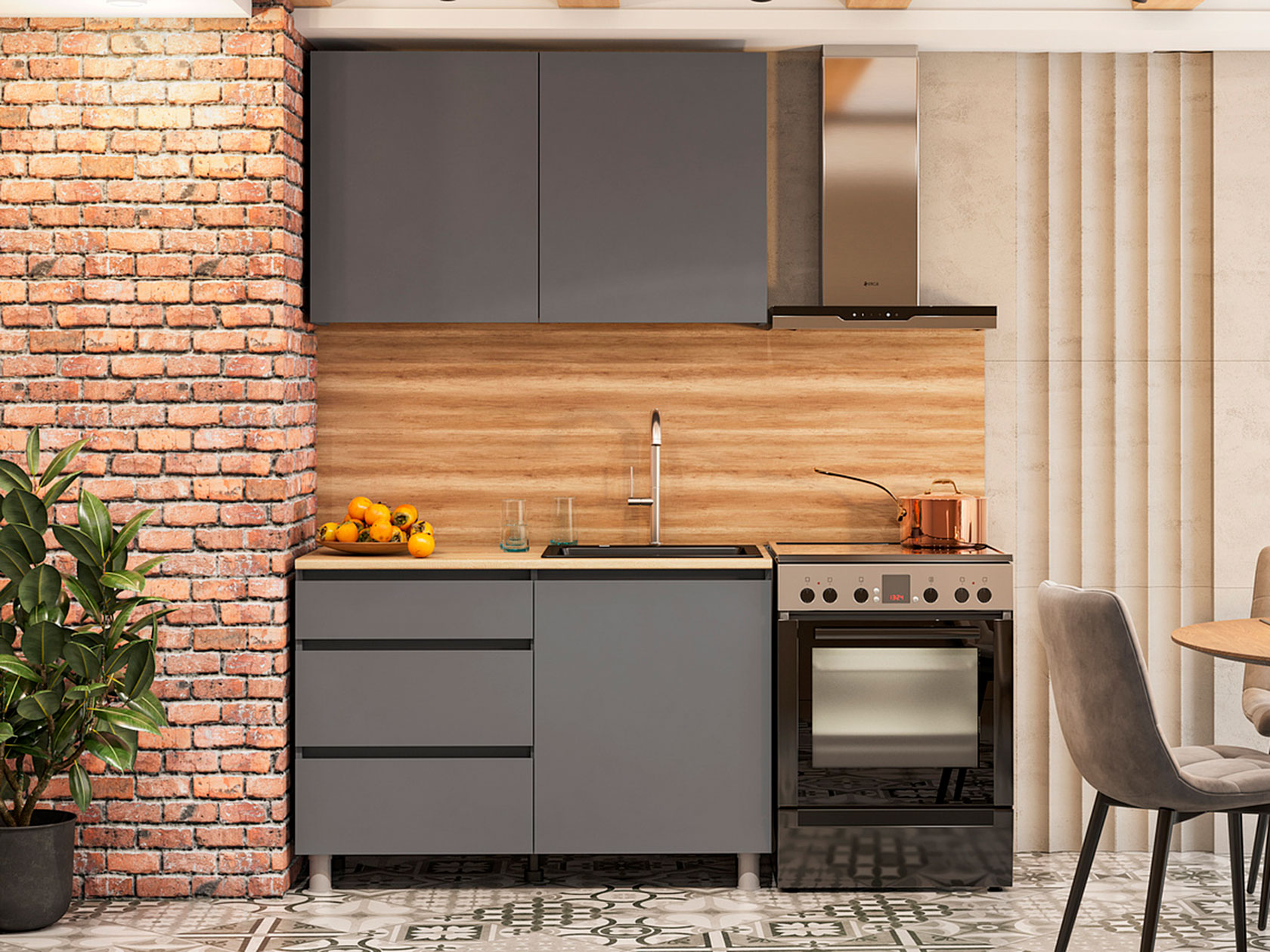 Обратите внимание, стеновая панель, плинтус, мойка и сушилка для посуды в комплект не входят.
