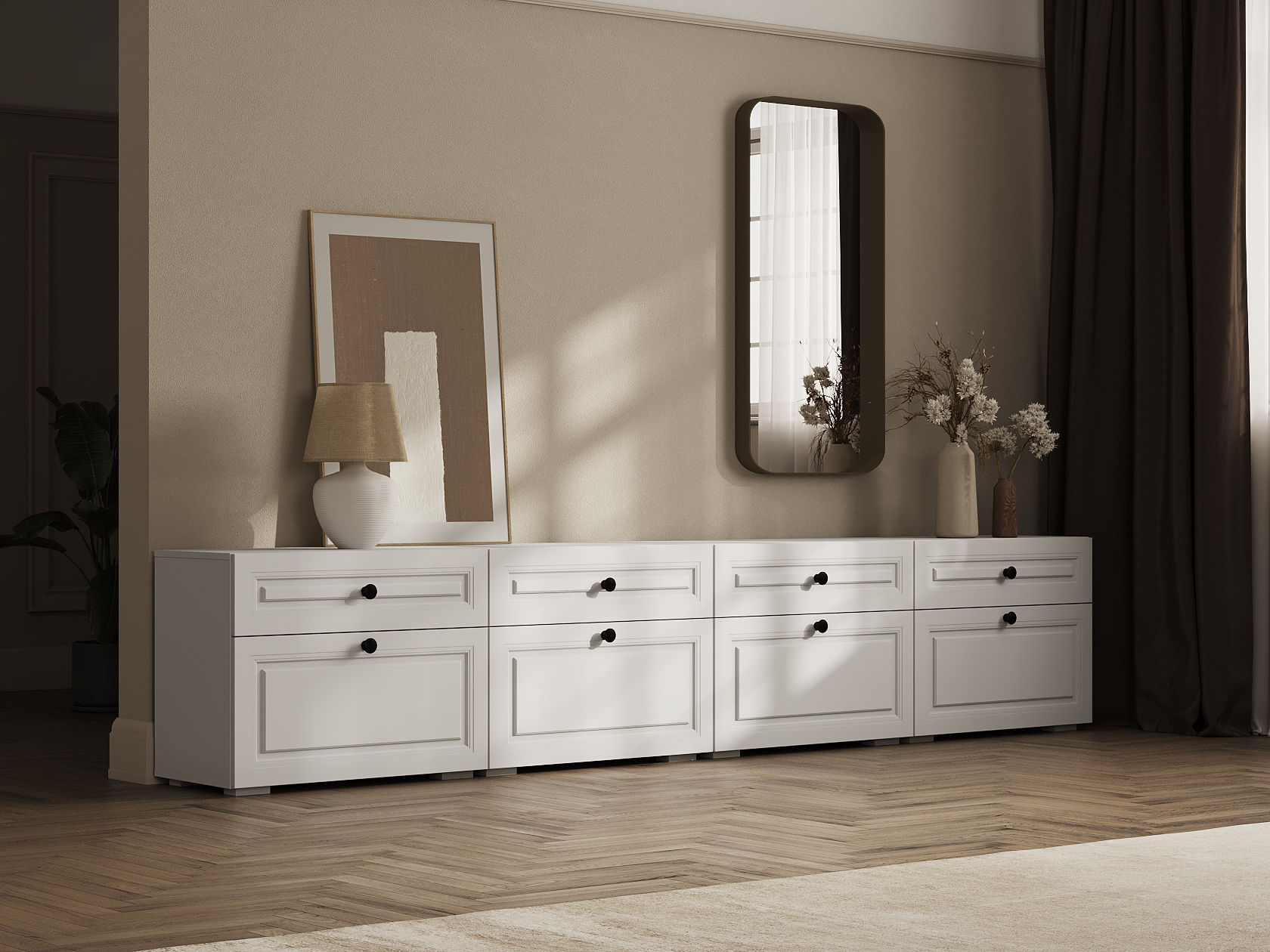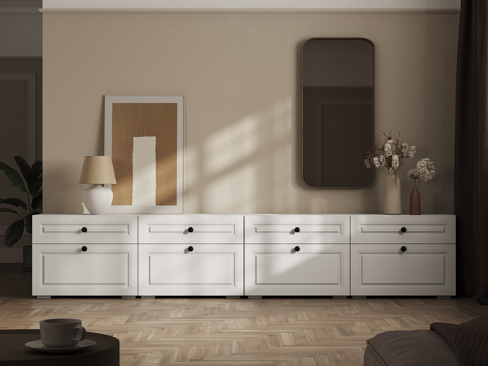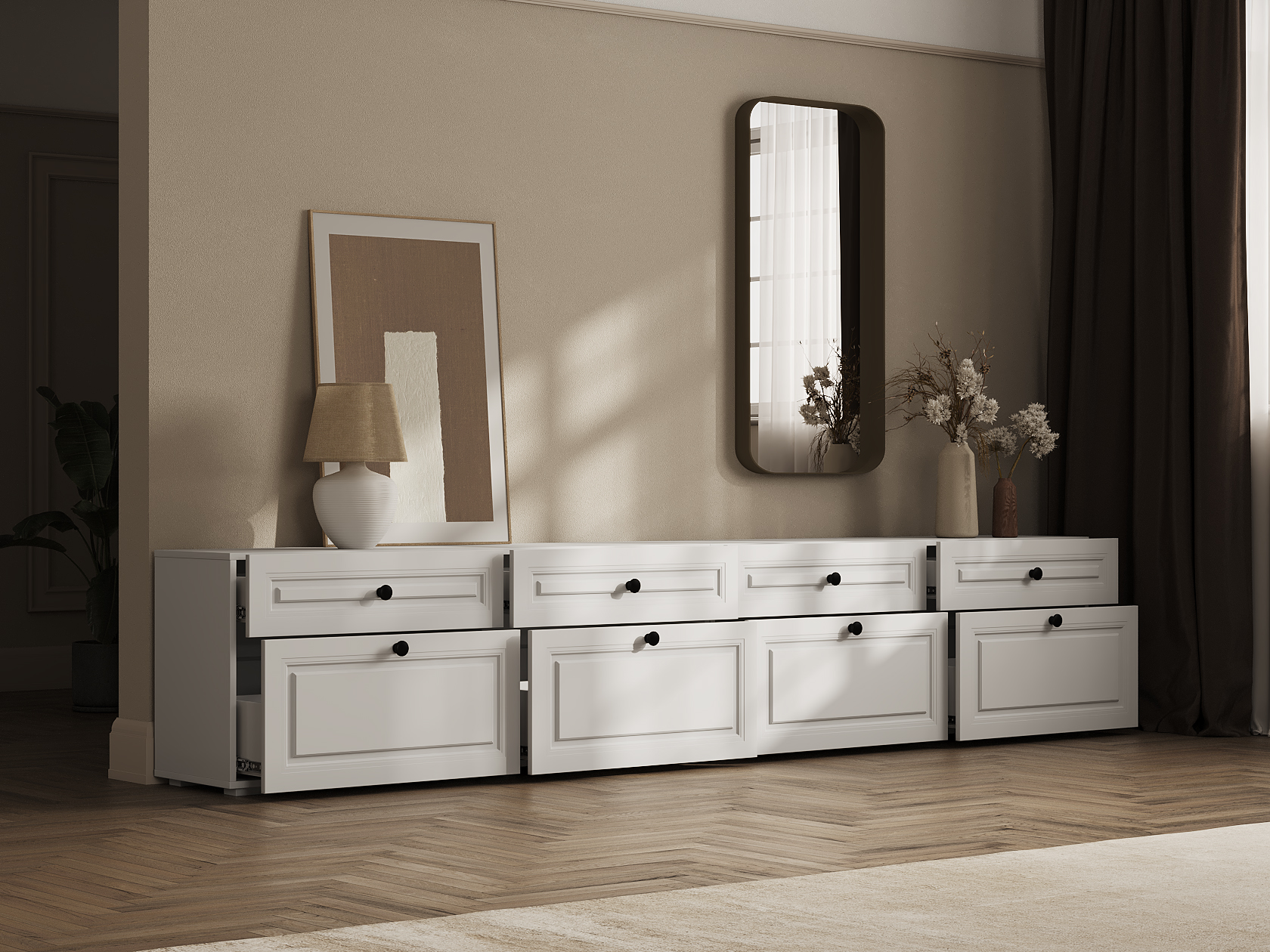 Набор ТВ-тумб Северина Дуэт — практичное и современное решение для большой комнаты. Пара элегантных моделей с выдвижными ящиками поможет обустроить уголок для семейного просмотра фильмов. На поверхности поместятся плоский телевизор с большой диагональю и вся сопутствующая мультимедиа-аппаратура. Строгий дизайн мебели в виде рамочных фасадов и ручек-кнопок легко адаптировать под разные интерьерные стили.