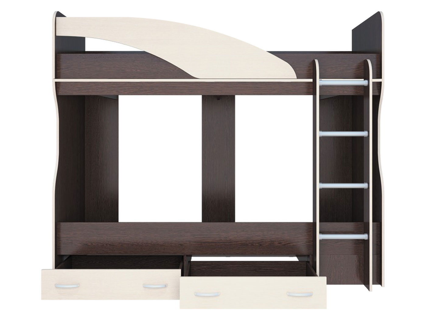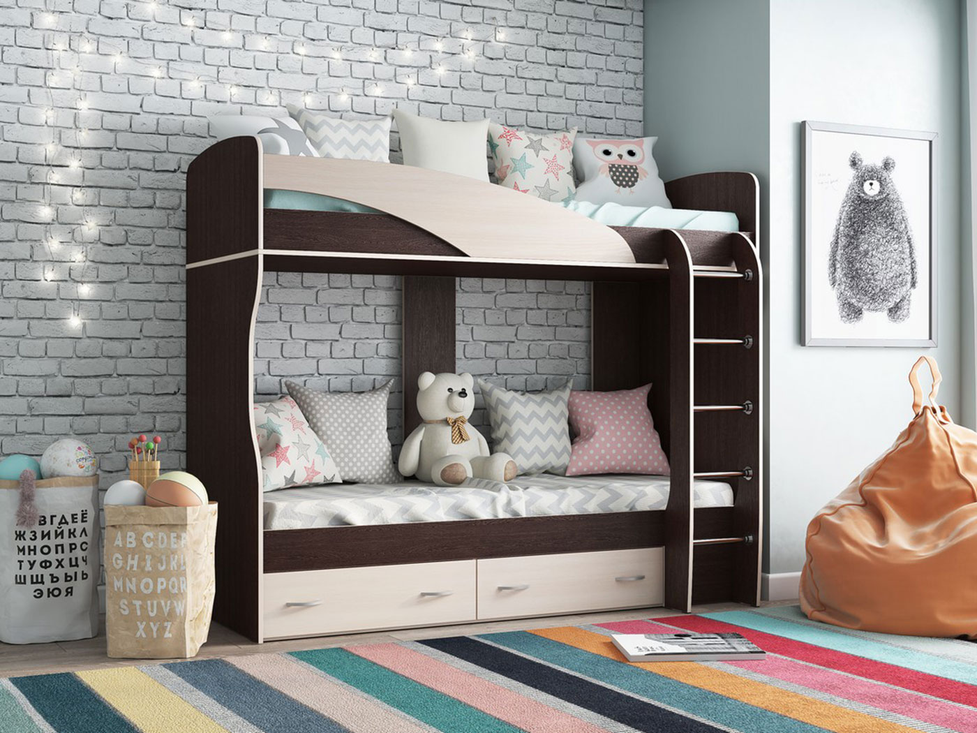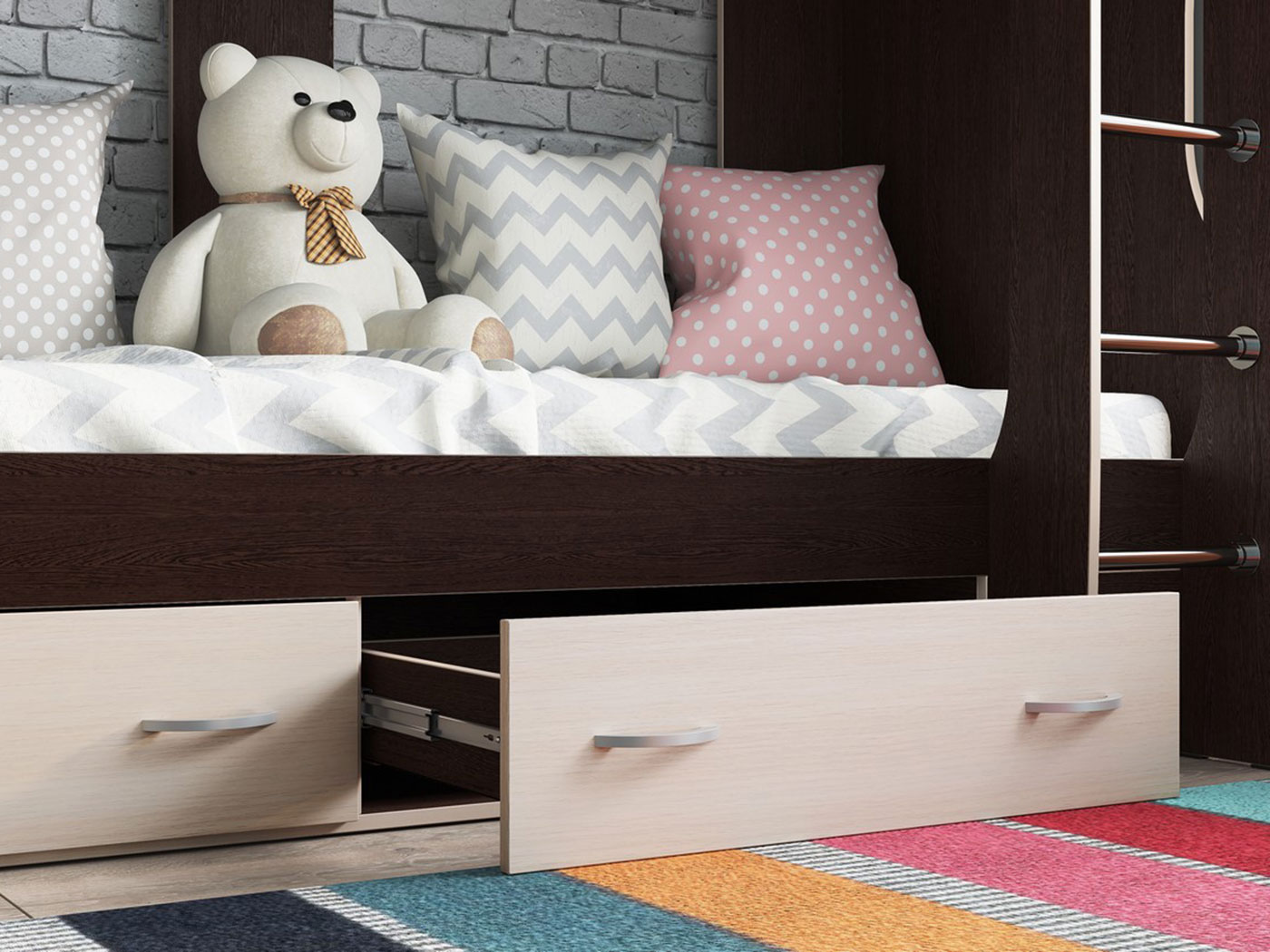 Двухъярусная кровать Мийа — компактная, но при этом функциональная модель. Спальные зоны, расположенные друг над другом, позволяют эффективно использовать пространство комнаты. Защитный бортик на верхнем ярусе оберегает от случайного падения во время отдыха. Лестница с перекладинами добавляет элемент игры в обстановку детской. Под нижним ярусом предусмотрены выдвижные ящики для хранения постельного белья и других вещей. Плавные линии и округлые формы добавляют силуэту мягкости и обеспечивают безопасность.