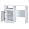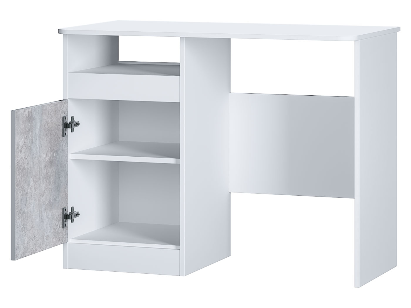 Детский письменный стол Паскаль поможет создать комфортный уголок для учебы и саморазвития. На просторной поверхности найдется место для компьютера или ноутбука. В открытой нише и за распашной дверцей удобно держать под рукой канцелярские принадлежности и учебники. Матовый фасад имитирует текстуру бетона, что придает мебели современный вид.
