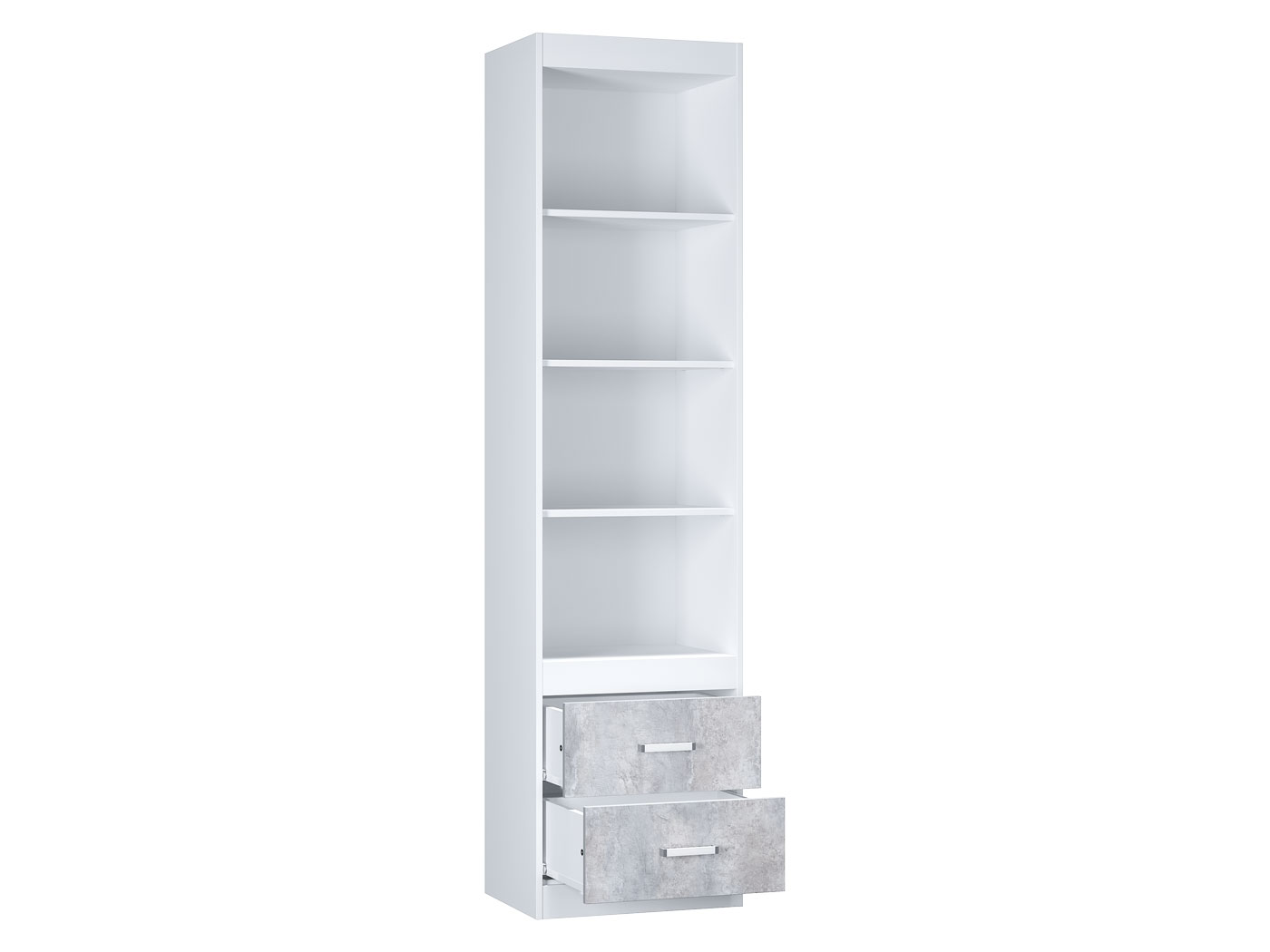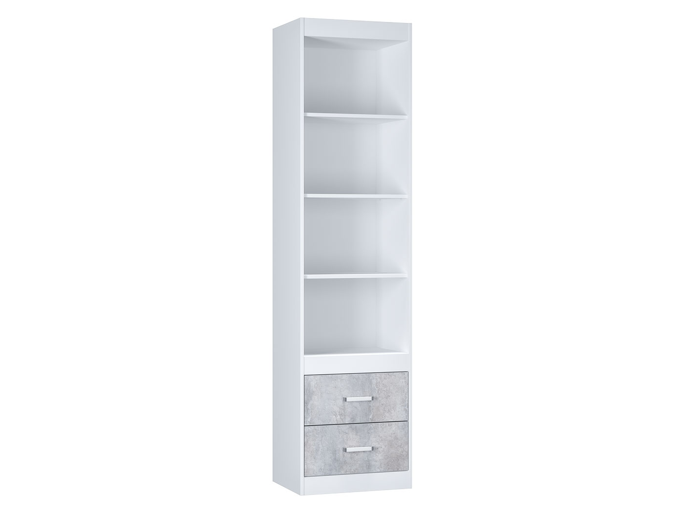 Детский стеллаж Паскаль удачно разместится в небольшой комнате благодаря узкой конструкции. Открытые полки позволяют расположить на виду книги, игрушки и предметы декора. Выдвижные ящики подойдут для хранения различных мелочей. Фасады с имитированной текстурой бетона дополнены контрастными ручками, что создает актуальный вид мебели.
