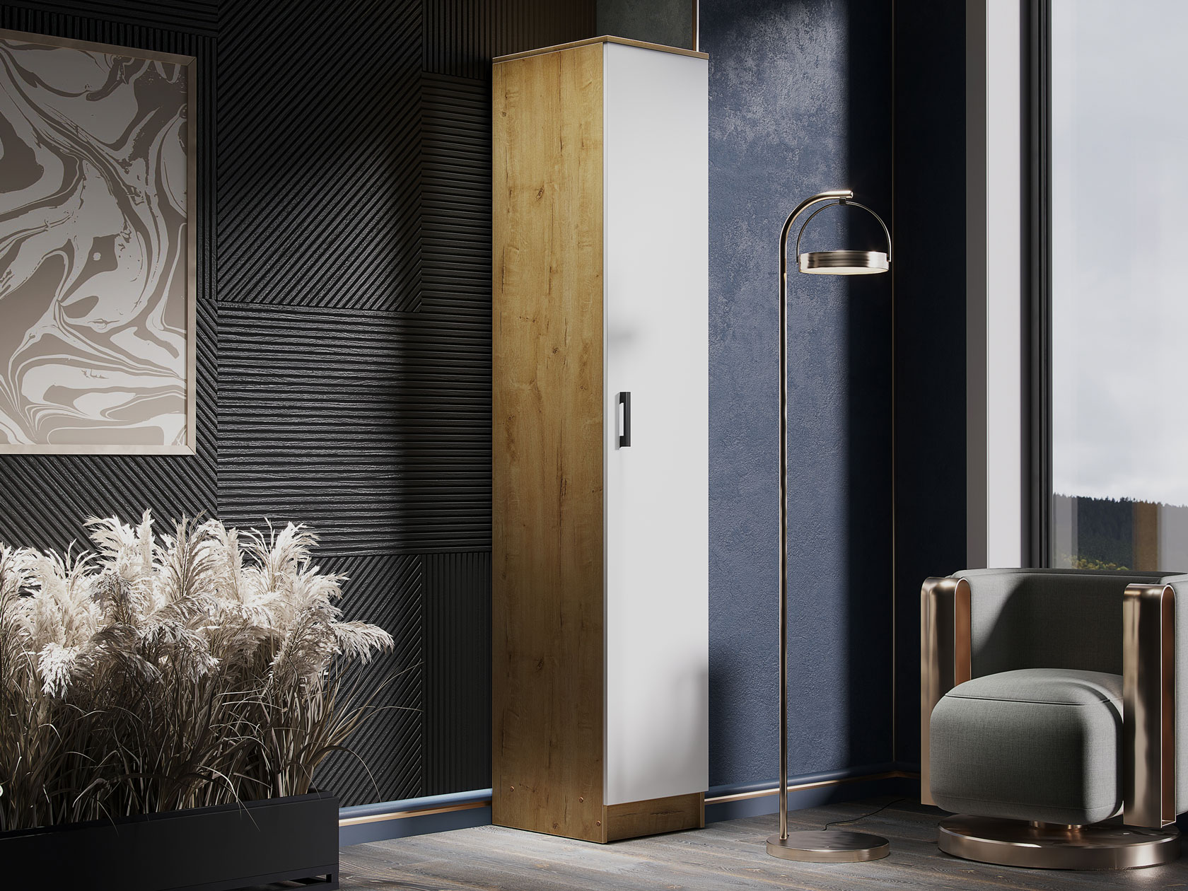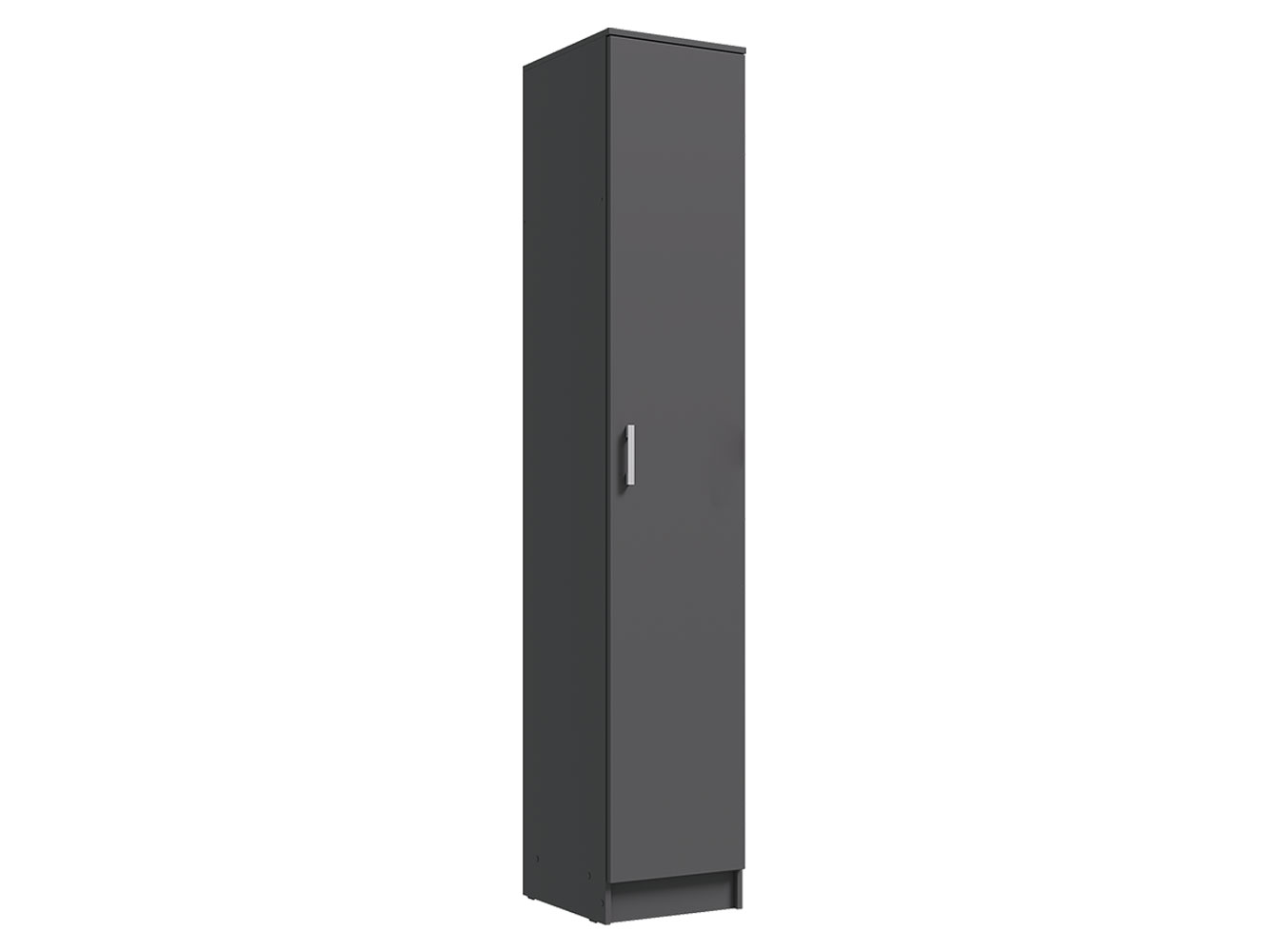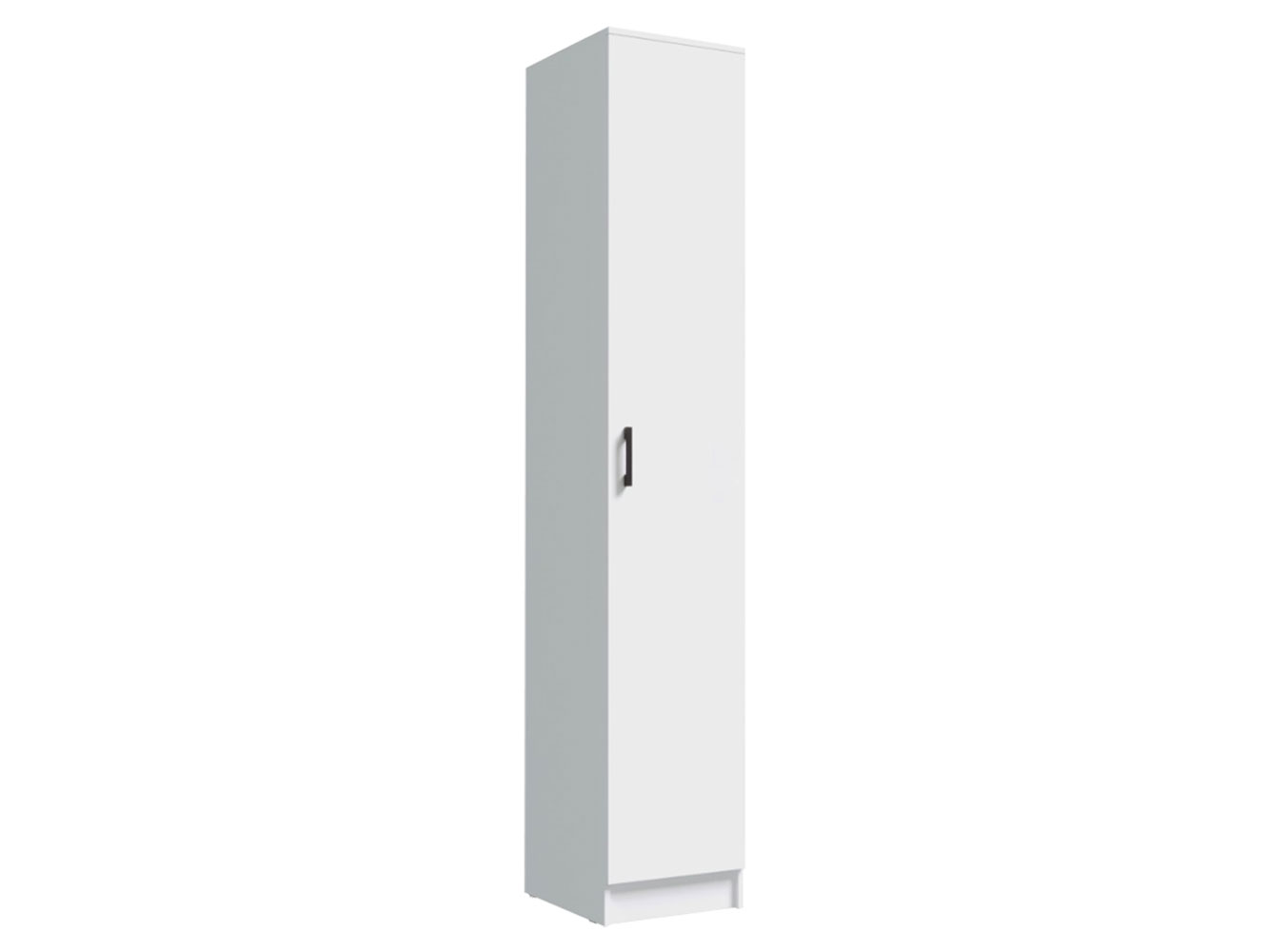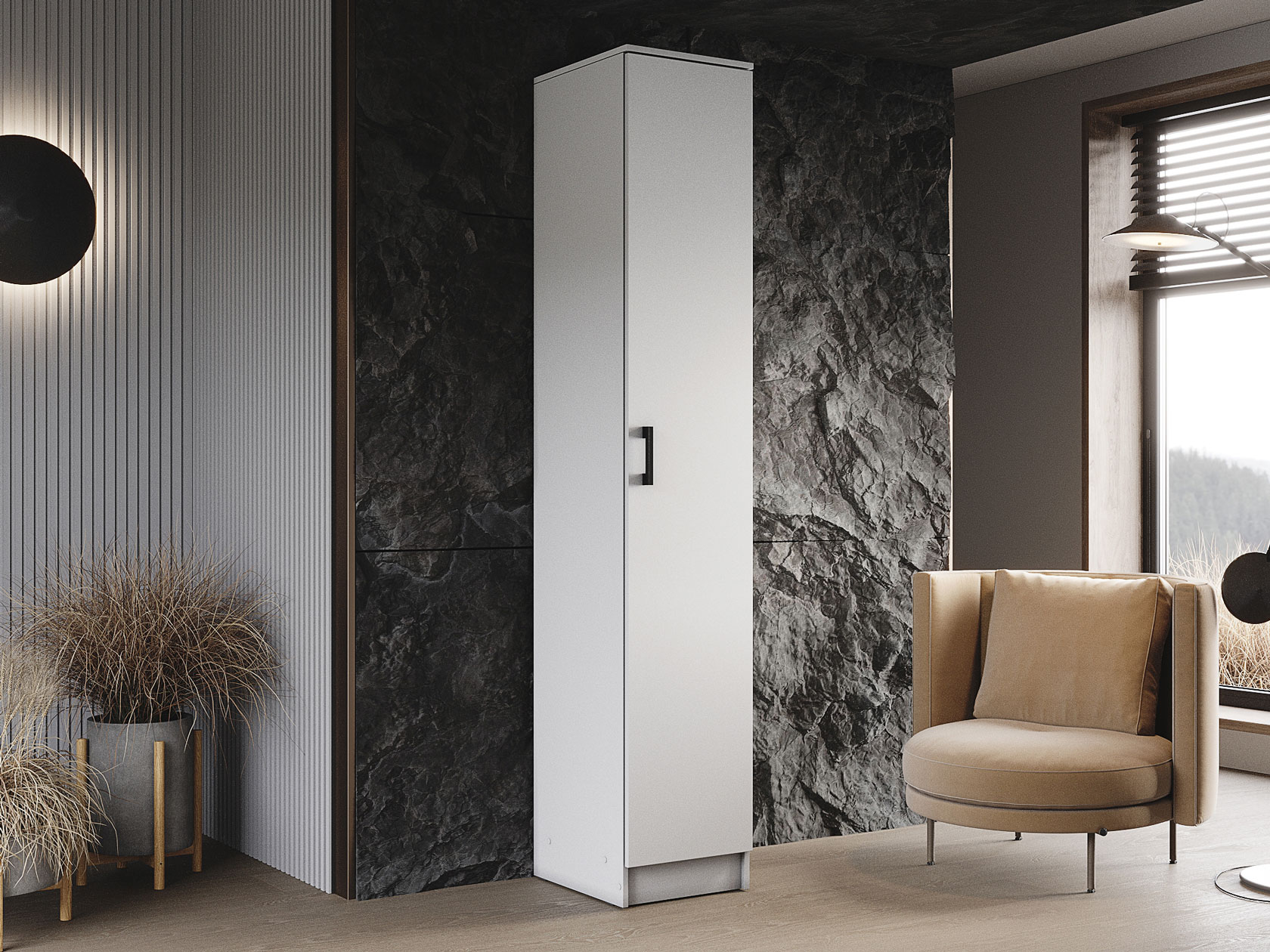 Шкаф-пенал Эко — универсальная модель для хранения любых необходимых вещей: от документов и книг до предметов гардероба. Высокую узкую конструкцию удобно расположить даже в комнате с ограниченной площадью. Гладкий матовый фасад без декора придает мебели лаконичность, а стильная ручка выступает небольшим акцентом.