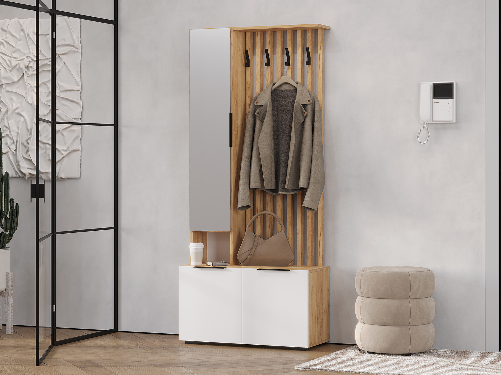 Прихожая Сандра позволит обустроить уютное пространство в небольшой входной зоне. Компактная и визуально легкая конструкция выполнена в натуральных природных оттенках с минималистичной фурнитурой, которая не нарушает лаконичного стиля. За распашными дверцами можно спрятать обувь и аксессуары, а на крючках — аккуратно развесить повседневную одежду.