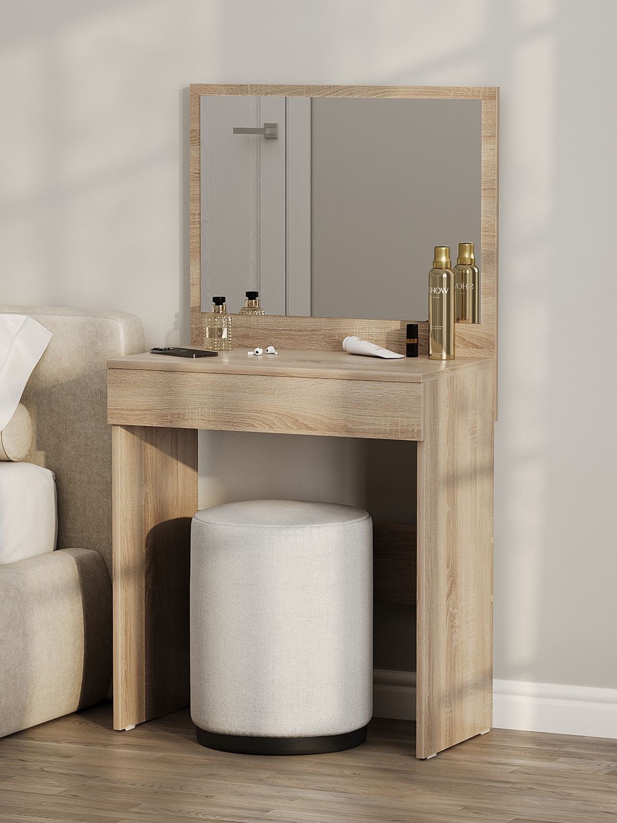 Туалетный столик Форте идеально подойдет для небольших помещений. Лаконичный дизайн легко интегрировать в любой интерьер. Широкое зеркало позволяет в деталях рассмотреть отражение во время нанесения макияжа и ухода за собой. В небольшом ящике удобно хранить косметику и аксессуары.