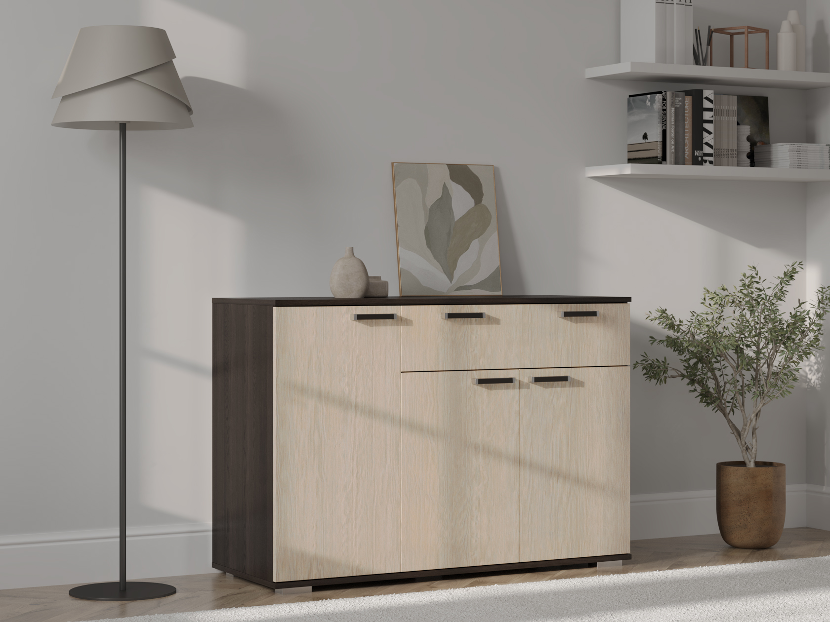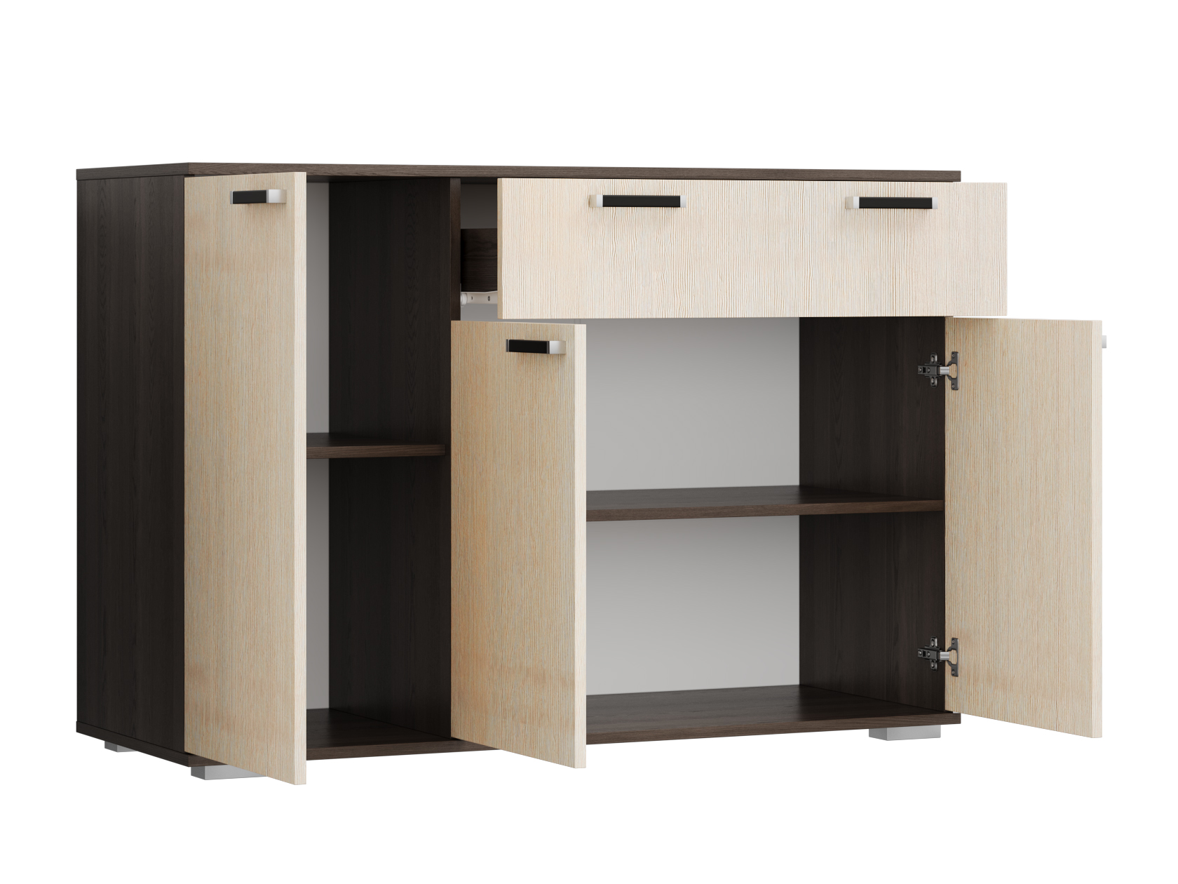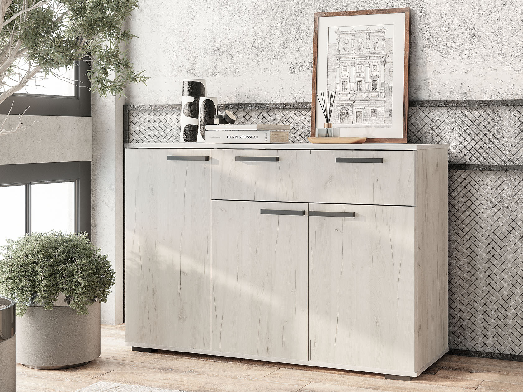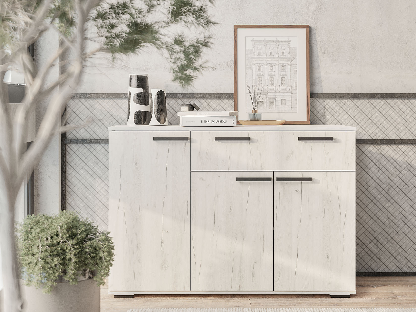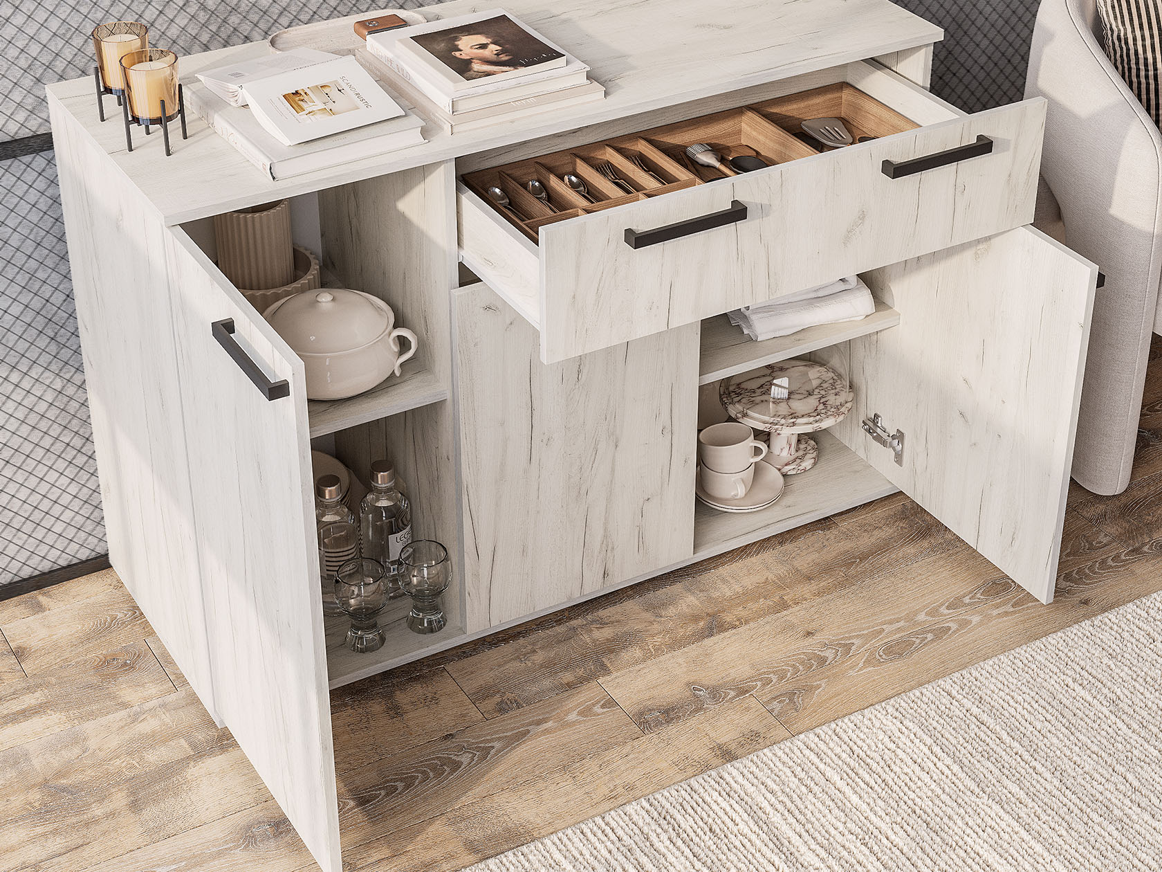 Комод Стандарт 4 расширит систему хранения и украсит современный интерьер. Закрытая система хранения представлена двумя отделениями с полками за распашными дверцами и выдвижным ящиком. Такое наполнение позволяет удобно разместить любые вещи и предметы обихода. Древесные оттенки придают модели привлекательный вид.