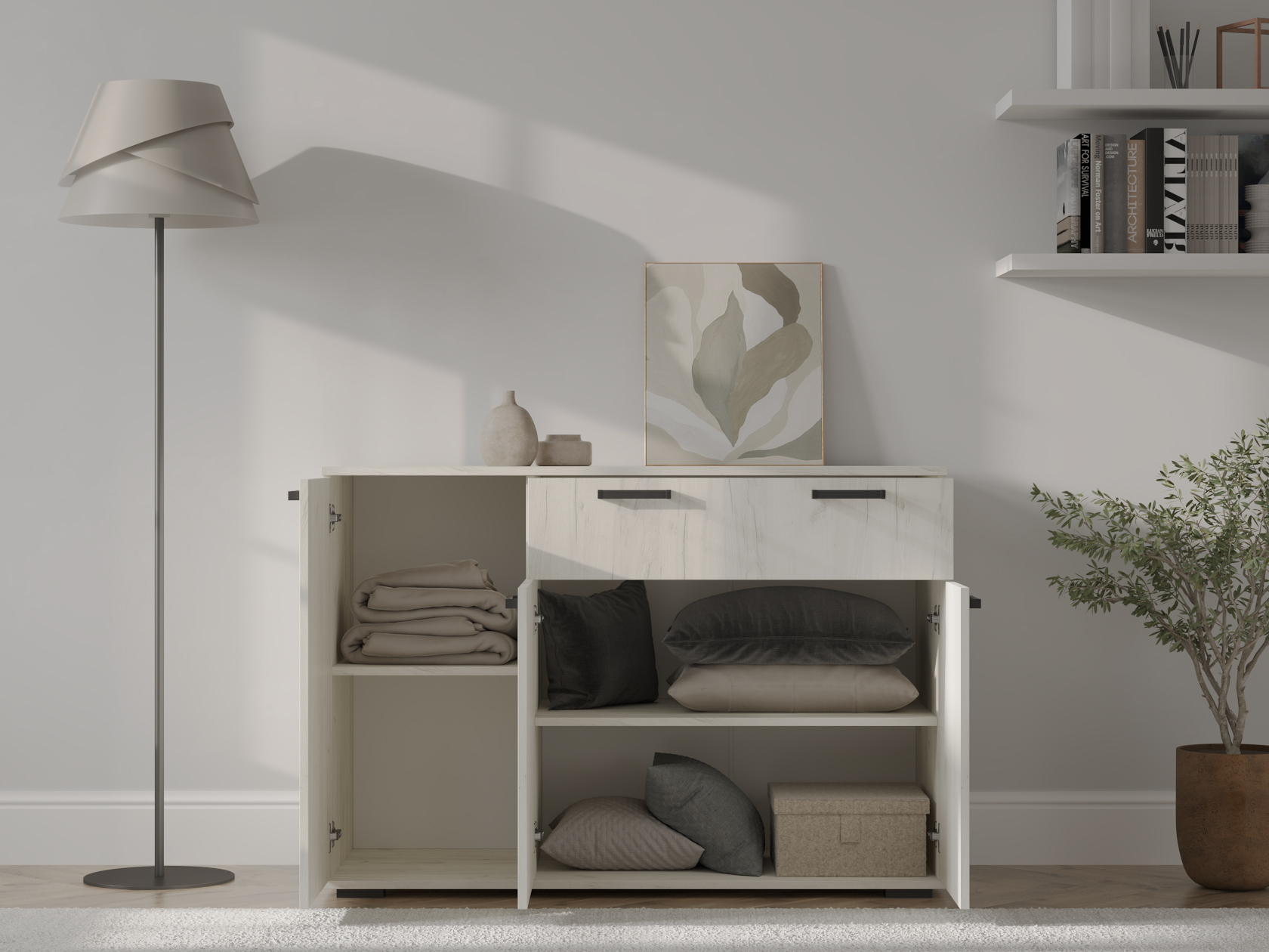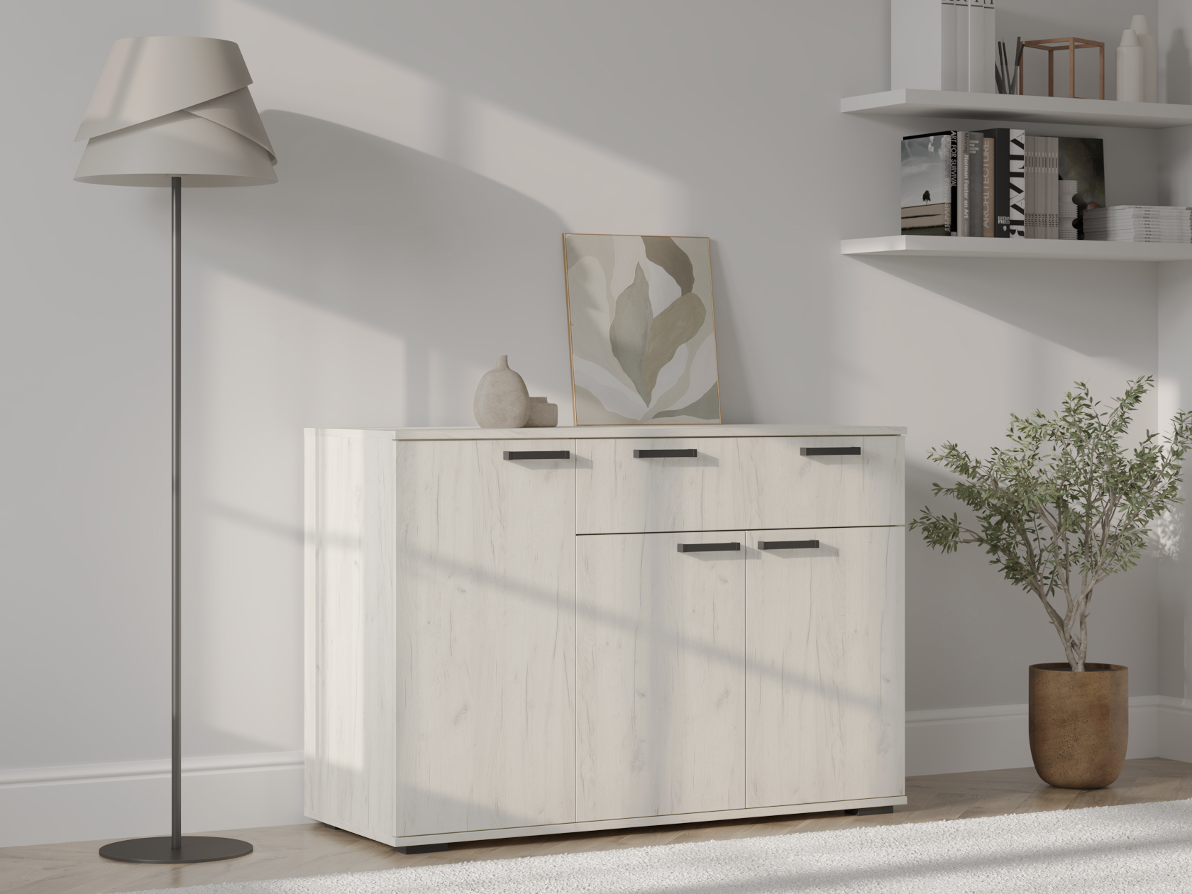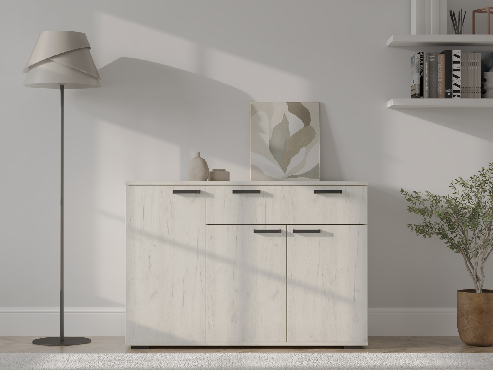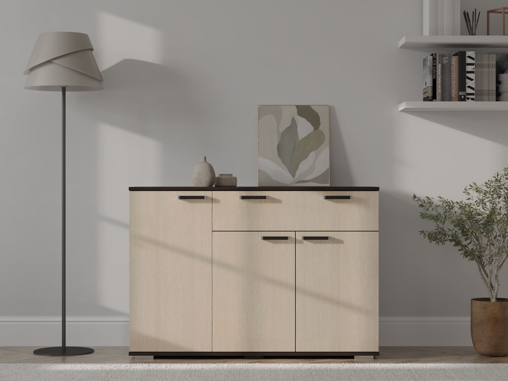 Комод Стандарт 4 расширит систему хранения и украсит современный интерьер. Закрытая система хранения представлена двумя отделениями с полками за распашными дверцами и выдвижным ящиком. Такое наполнение позволяет удобно разместить любые вещи и предметы обихода. Древесные оттенки придают модели привлекательный вид.