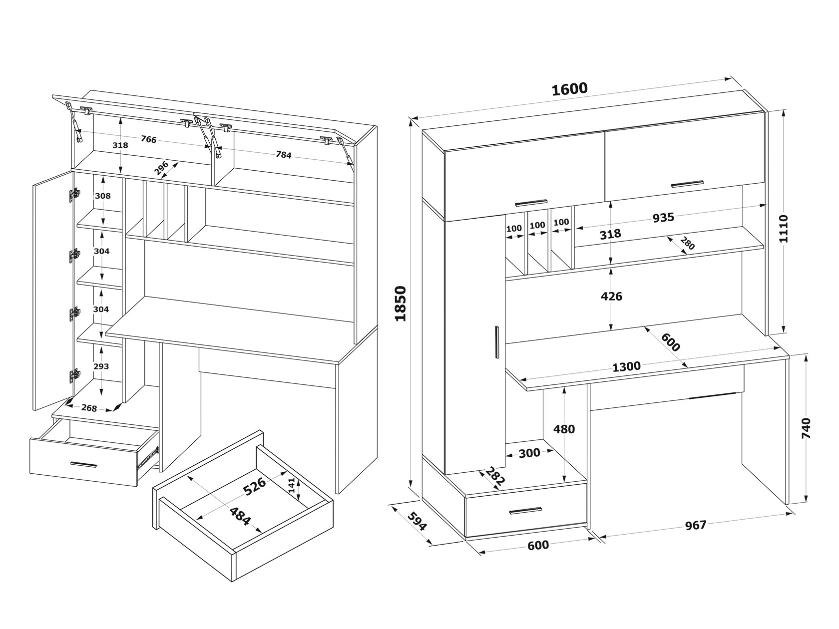 Над столешницей расположена надстройка с полочками, а также двумя закрытыми отделениями, дверцы которых поднимаются при помощи газлифтов. К надстройке примыкает стеллаж с распашной дверцей, за которой скрыты 3 полки. Под столешницей расположена ниша для системного блока, а также выдвижной ящик на шариковых направляющих.