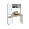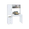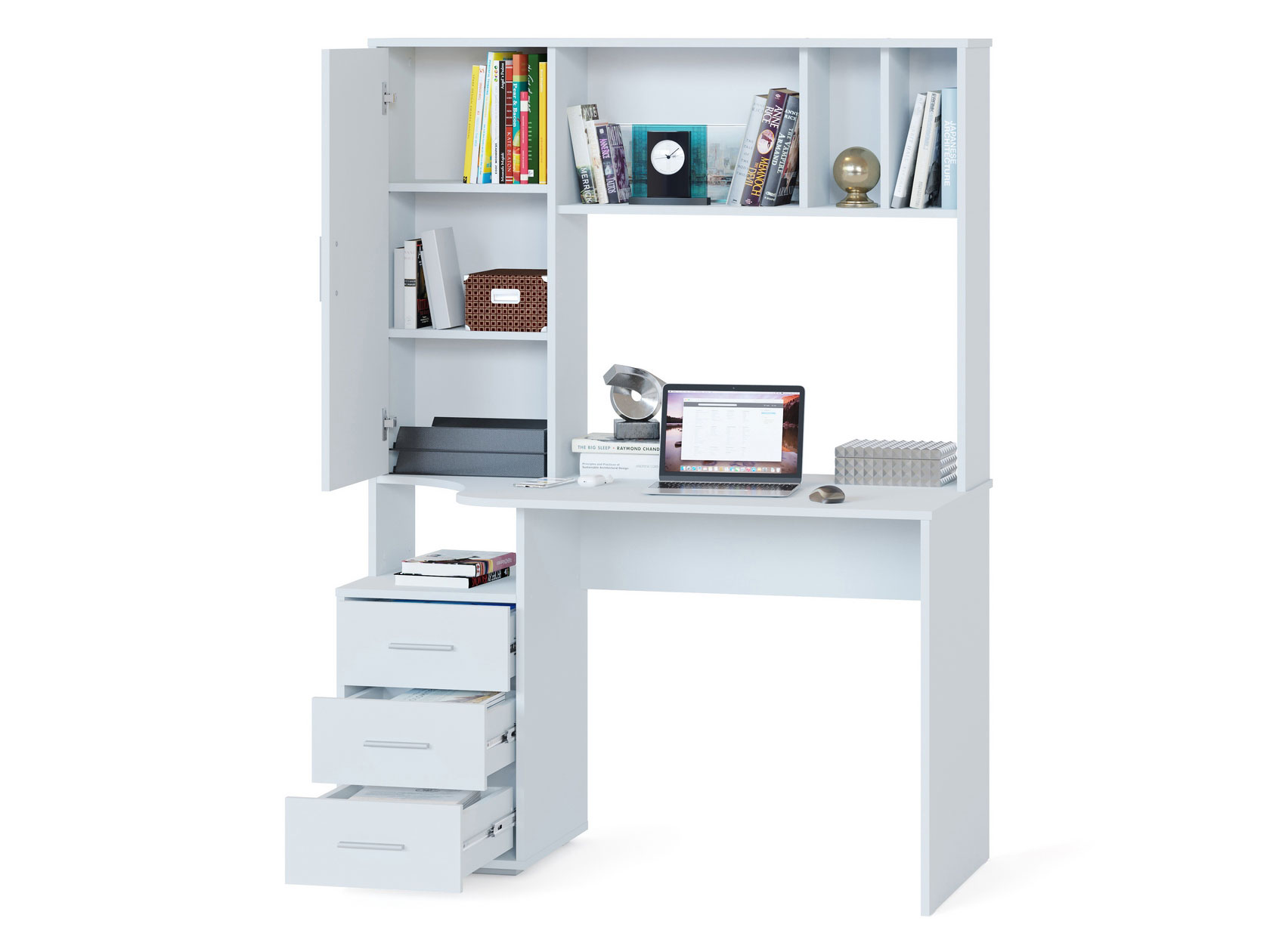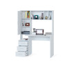 функциональный — оснащен тумбой с тремя ящиками и надстройкой с полками и стеллажом;