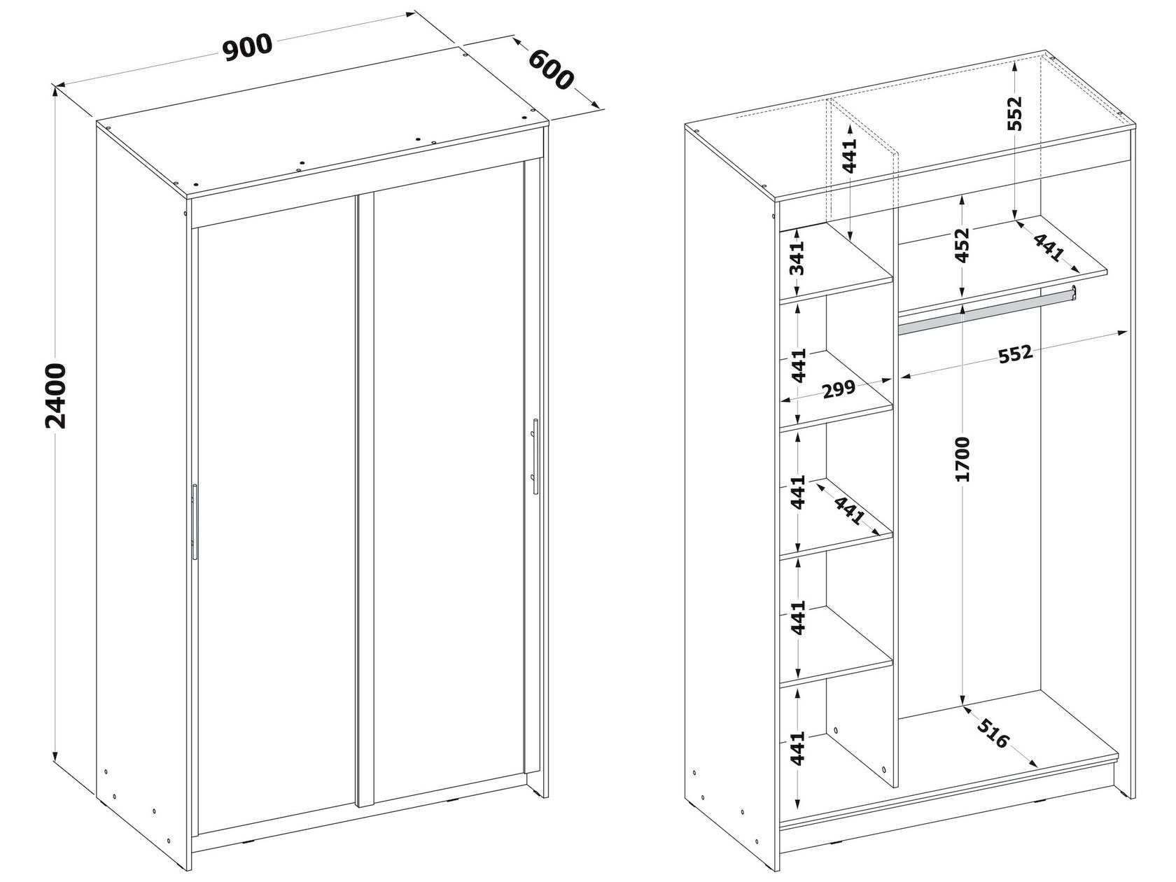 Шкаф-купе Контур ШР-2 оснащен продольной штангой и несколькими вместительными полками. Внутри отлично помещается верхняя и повседневная одежда любой длины, а также другие предметы гардероба, чемодан или коробки с обувью. Такой шкаф — оптимальный выбор для небольшой спальни или прихожей, поскольку не требует дополнительного пространства при открывании дверей.